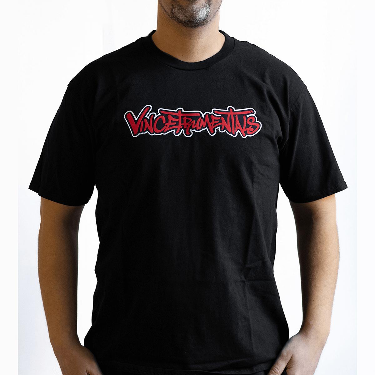 Premium T-shirt met VINCETRUMENTALS logo op de voorkant, klein logo achteraan, afgewerkt met custom inner label.